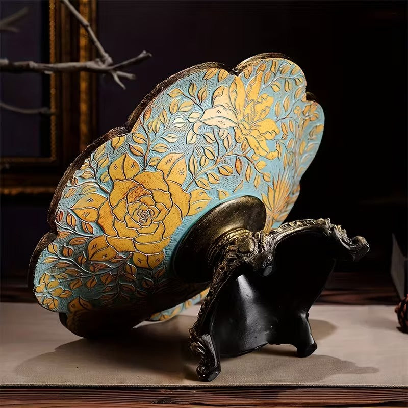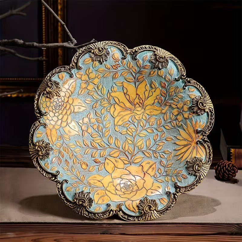 - Taca: Płytka taca z falistą krawędzią i tłoczonym wzorem dużych kwiatów i liści.