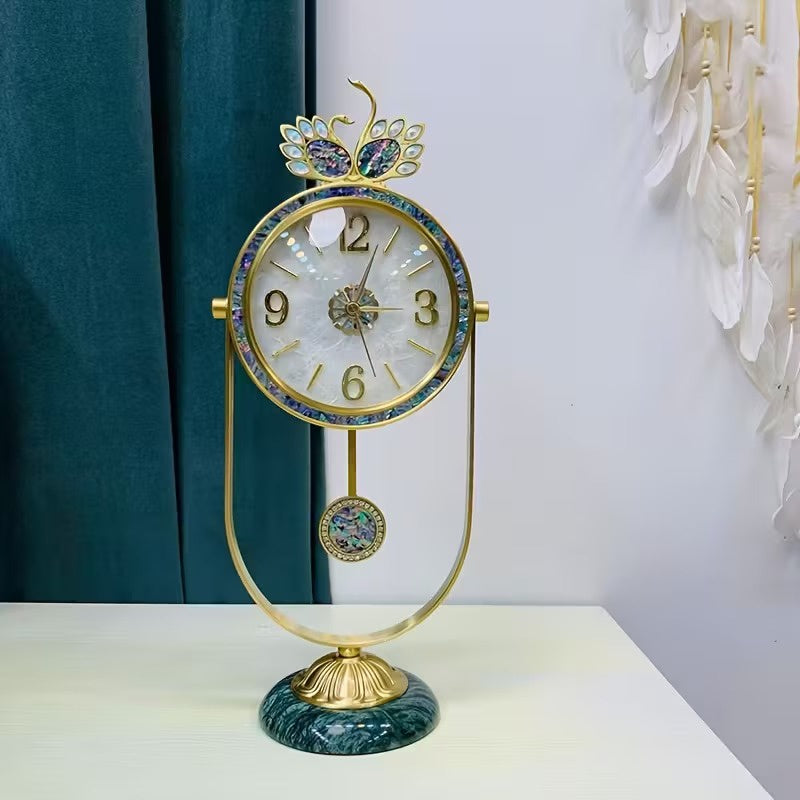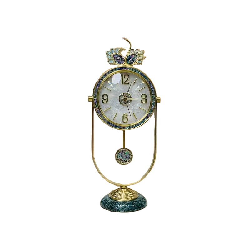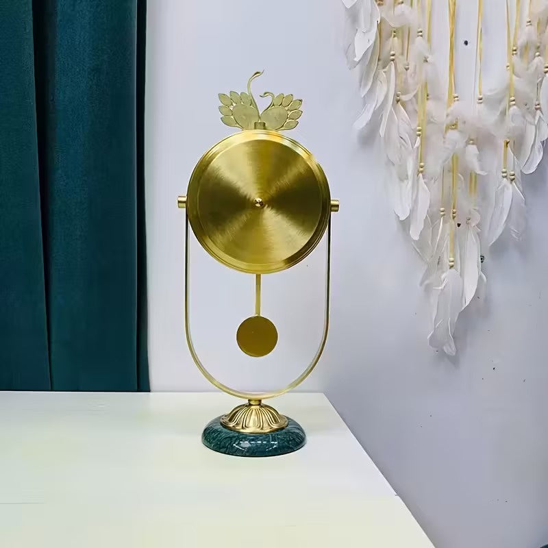 Ten wolnostojący zegar posiada okrągłą tarczę z dekoracyjnym elementem górnym. Tarcza zegara osadzona jest w ramie i zawiera znaczniki godzin oraz wskazówki. Pod tarczą znajduje się wahadło, zawieszone w zakrzywionej ramie, która stanowi główną część stojaka. Całość spoczywa na teksturowanej podstawie, dzięki czemu nadaje się do ustawienia na stole lub postumencie.