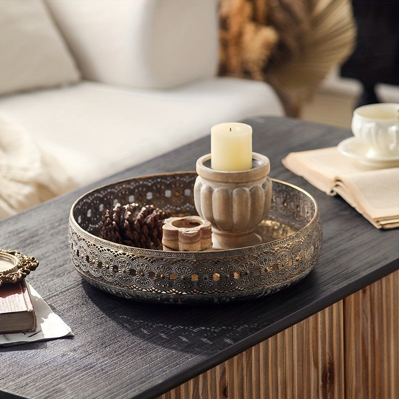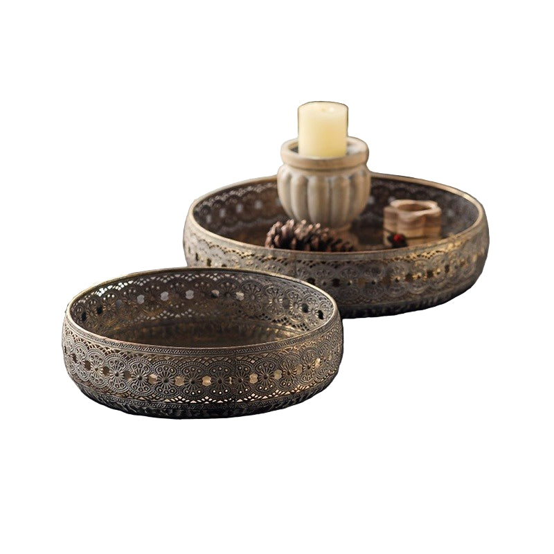 Ten zestaw zawiera dwie okrągłe dekoracyjne tace. Tace różnią się wielkością – jedna jest większa od drugiej. Boki zdobi perforowany wzór z połączonych kształtów.