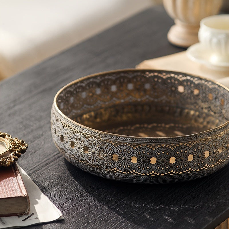 - Styl: Boki ozdobione perforowanym wzorem z połączonych kształtów, identycznym w obu tacach.